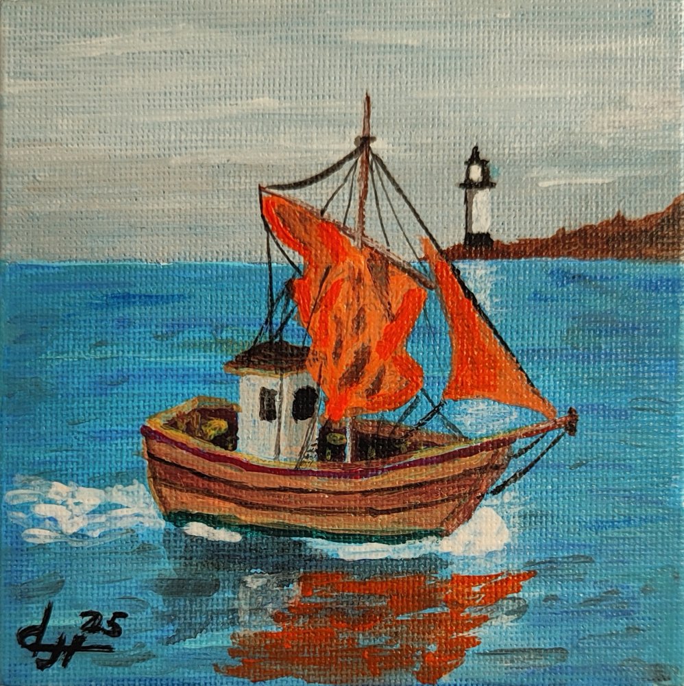 Cuadro original pintado a mano con acrílicos sobre lienzo montado en tabla de 10x10 cm. La obra muestra una barca tradicional con velas naranjas navegando frente a la costa, con un faro en el horizonte y reflejos vibrantes en el agua. Es una pieza llena de color ideal para amantes del mar, la pesca artesanal o la decoración náutica
