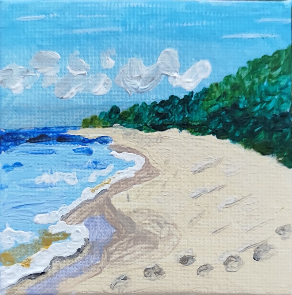 Este óleo cuadrado miniatura evoca una playa desierta mediterránea al amanecer o atardecer, con dunas verdes frondosas, arena pálida salpicada de huellas humanas frescas y olas suaves lamiendo la orilla bajo cielo nuboso azul claro. La soledad introspectiva invita a paseos contemplativos en parajes vírgenes.