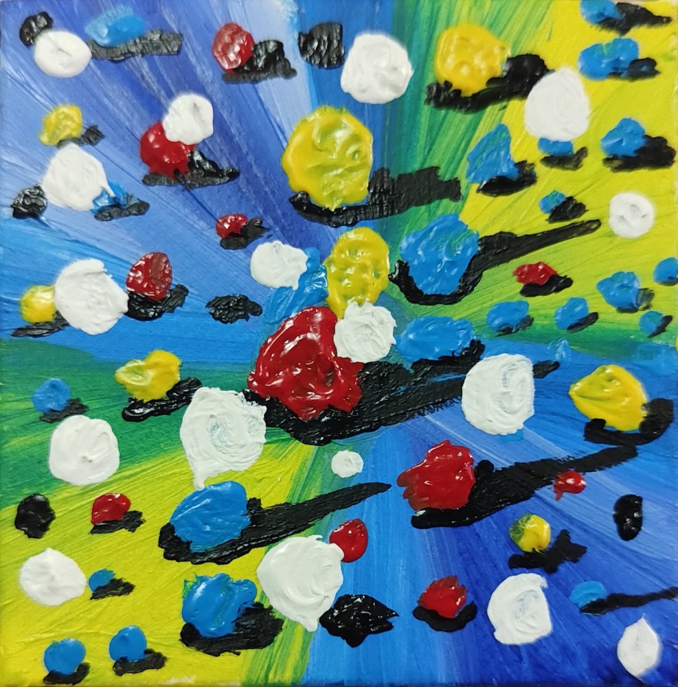 Círculos y gotas en rojo central, blancos, amarillos, verdes y azules se proyectan en radios desde núcleo globular rojo, con trazos negros irregulares como grietas o rayos amplificando explosión. Sin profundidad ilusoria, el azul base actúa como vacío cósmico, permitiendo superposiciones infinitas en formato miniatura. Ritmo centrífugo genera vértigo óptico hipnótico.