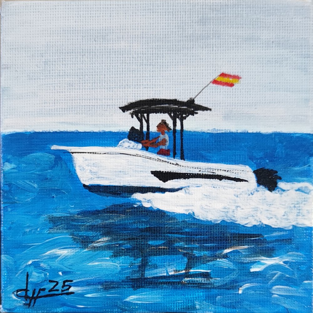 Este óleo cuadrado miniatura retrata un patrón español al timón de una lancha semirrígida blanca con flybridge negro y bandera española flameante, navegando aguas azules abiertas con estela espumosa tras motor fuera borda. La escena cotidiana captura esencia marinera mediterránea en jornada de pesca o paseo costero.